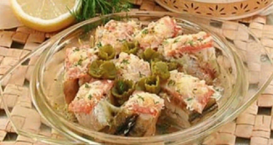 - Ungiamo i pezzi di pesce con il burro, cospargiamo di grattugiato formaggio e decorare con albumi d’uovo sodo. Puoi aggiungere verdure.