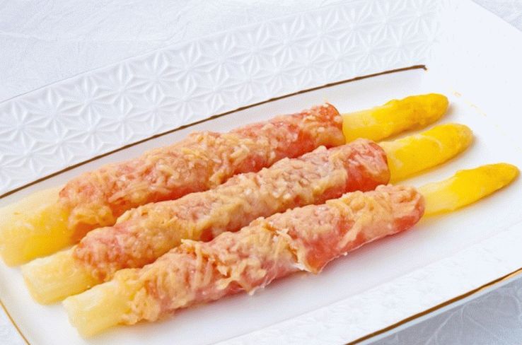- Avvolgere gli asparagi bolliti raffreddati in strisce di pancetta.