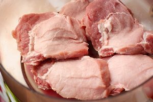 Tagliare il collo di maiale a pezzi di 1,5 cm di spessore e stendere in una ciotola.