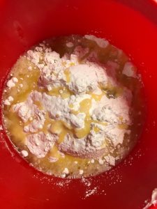 - Mescolare in una ciotola profonda con il resto degli ingredienti (il burro dovrebbe prima essere sciolto).  L’impasto dovrebbe essere abbastanza fluido.