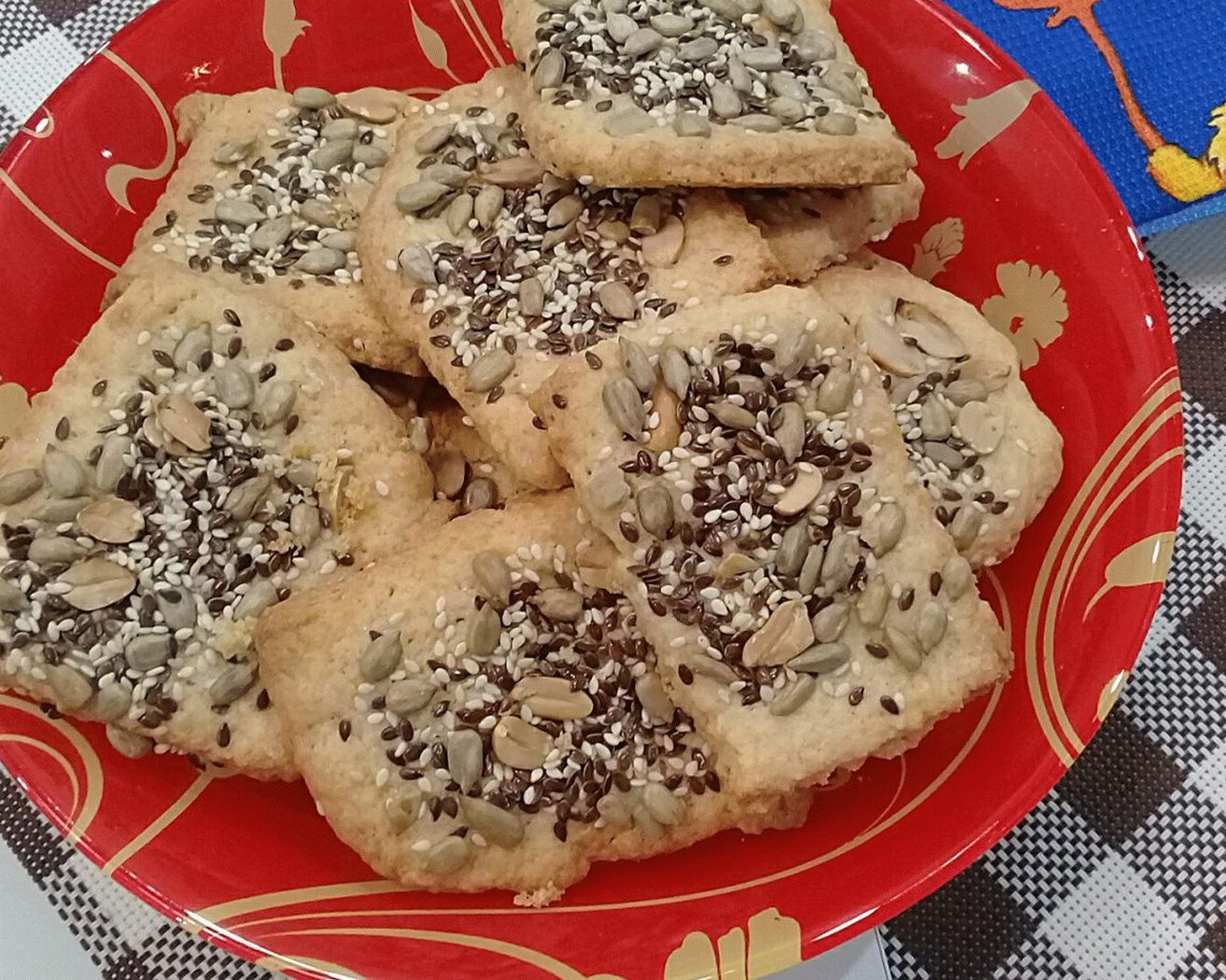 In una ciotola mescolare noci, semi, semi di sesamo e lino. Distribuire il composto di cereali sul biscotto, spremendolo un po ‘ i cereali sono fissi sui biscotti.