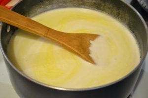 - Per il ripieno, mescolare latte, zucchero e burro, portare ad ebollizione.