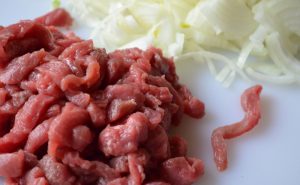 - Tagliare la carne attraverso le fibre in strisce lunghe e sottili.