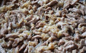 - In una padella riscaldata con olio, abbassare la carne, le cipolle, friggere a fuoco alto mescolando continuamente.