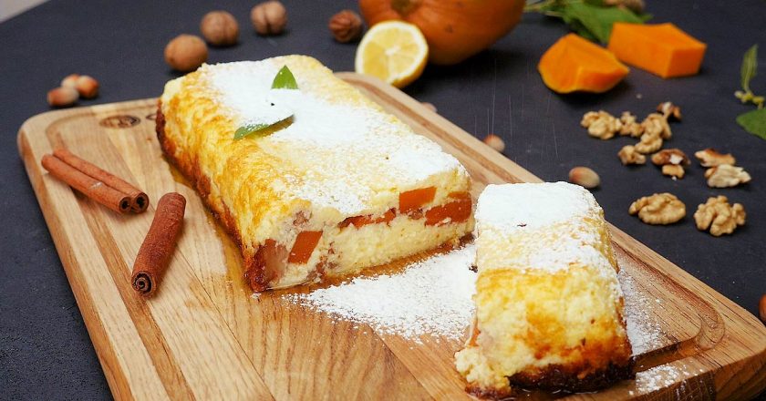 Deliziosa casseruola di ricotta può essere preparata per colazione o merenda a casa. Noci e zucca aggiungono dolcezza e piccantezza. lattina servire caldo o freddo.