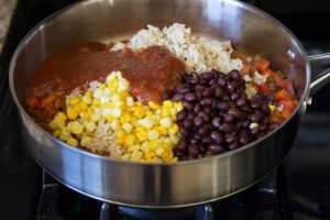 - Quindi gettiamo fagioli lavati, riso bollito, mais e versare la salsa salsa. Tutto va bene a interferire.