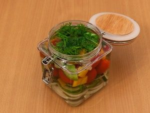 - Versare le verdure con una marinata calda. In ognuna delle tre risultanti lattine versare due cucchiai. l. aceto. Le banche si chiudono, si puliscono frigorifero per cinque giorni.