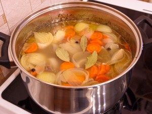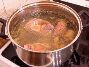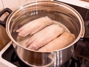 - Cosce di maiale pulite e accuratamente lavate a fuoco (4 litri di acqua). Portare a ebollizione e cuocere per cinque ore a fuoco moderato fuoco, rimuovendo periodicamente schiuma.