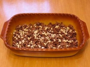 - Metti nello stampo carne bollita fredda e tritata, cospargere con aglio attraverso una pressa.