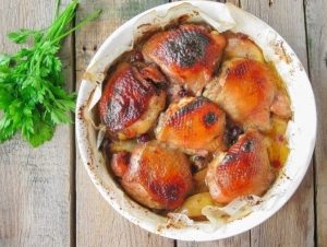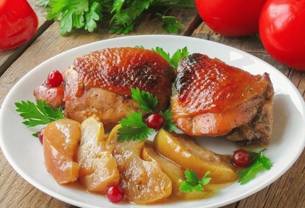 Cosce di pollo succose e deliziosamente deliziose, pre marinato in una salsa di miele, salsa di soia, olio vegetale e cucinato a casa su un “cuscino” di mele al forno. specialmente I mirtilli producono carne aromatica.
