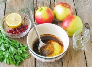 Distribuire i fianchi marinati sulle mele, versare la salsa, dentro quale pollo marinato e cospargere di mirtilli rossi.