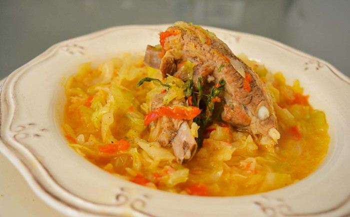 Metti le costolette succose finite sui piatti, aggiungi cavolo in umido con pomodori e servire con pane fresco. Piatto di se lo desideri, puoi aggiungere spezie ed erbe aromatiche a piacere.