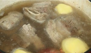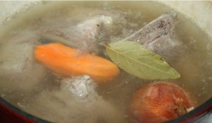 - In ghisa cuciniamo il brodo dalle costole a fuoco basso. Dopo l’ebollizione rimuovere la schiuma e mettere la cipolla, la carota, la foglia di alloro. Cuocere per 2 ore.