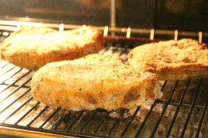 Laviamo le cotolette di maiale sull’osso, asciugiamo con la carta asciugamani, cospargere di sale, pepe macinato e prezzemolo essiccato. Impanare le cotolette preparate con il pangrattato e spalmarle teglia con griglia; coprire il fondo con un foglio. Così sarà la carne cuocere in modo uniforme e mantenere tutti i succhi all’interno.