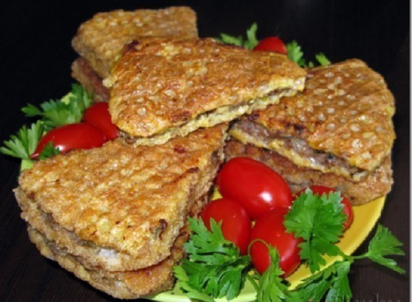 - Tagliare a triangoli. Immergi un uovo e friggi padella su entrambi i lati a fuoco medio. Il tempo di frittura dipende spessore della cotoletta. La padella può essere coperta con un coperchio.