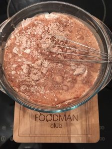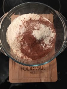 - Per preparare l’impasto, devi mescolare tutti gli ingredienti secchi e vale a dire, 2 cucchiai.  farina, 1 cucchiaio.  zucchero, 6 cucchiai  cacao e 4 cucchiaini lievito in polvere (soda).
