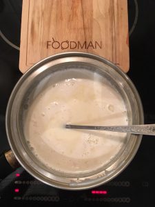 - 2 cucchiai.  riscaldare il latte sul fornello, ma non portare a ebollizione.  il il latte caldo aggiunge la massa risultante.  Mescolare costantemente e Porta la crema alla consistenza cremosa desiderata.