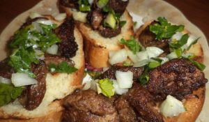 - Metti il fegato fritto con cipolle ed erbe sopra i toast.
