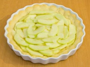 - Stendi uno strato uniforme di mele sull’impasto.