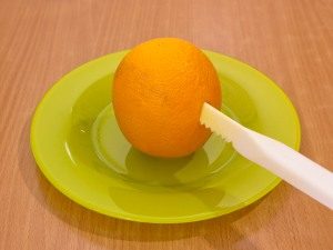 - Seleziona arance della stessa dimensione. Lavare, pulire fare asciugamani di carta, un coltello speciale o ordinario taglia in cerchio con un piccolo zigzag.