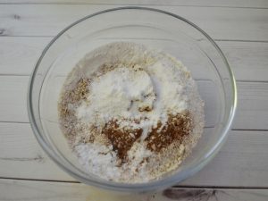 - Macina la farina d’avena fino alla farina. In una ciotola, mescolare tutti gli ingredienti secchi.