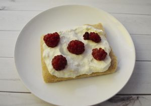 - Tagliare la torta in rettangoli o quadrati, grasso la crema risultante e aggiungere i lamponi. Quindi ripeti tre volte.