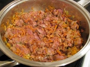- In uno stufato riscaldato, friggere l’olio da cucina cipolle e carote tritate.
