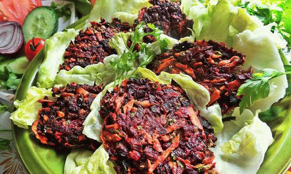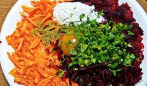 - Sbucciate le barbabietole, le carote, grattugiate in grande grattugia Aggiungi condimenti, erbe, uova, farina, rimanente cipolla, mescola bene.
