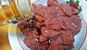 - Sbucciare il fegato dal film, marinare in salsa di soia per 15 minuti.