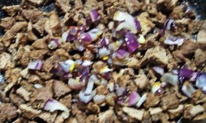 - Metti in una padella, friggi con le spezie. pezzo di cipolla, continua a friggere per cinque minuti.