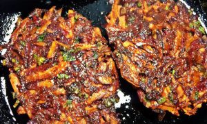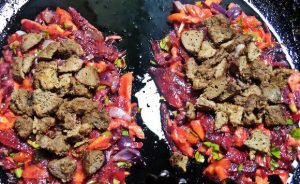 - Scaldare l’olio in una padella, mettere due porzioni della miscela di verdure, per formare cotolette piatte. Metti un fegato su ciascuno.