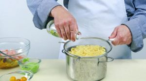 - Bollire la pasta fino a cottura. Ci sdraiamo in uno scolapasta e cospargere di olio, mescolare e raffreddare.