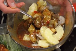 Nella ciotola in cui si trova la salsa, devi gettare il necessario la quantità di gamberi sbucciati e mezzo ananas. Tutti gli ingredienti mescolare accuratamente.