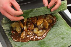 Versare i prodotti con la salsa sopra il pesce. banana avvolgere le foglie sotto forma di una busta e mettere su una teglia. infornare prodotti in forno ad una temperatura di 180 gradi per 25 minuti. Come contorno, puoi usare riso bollito con spezie.