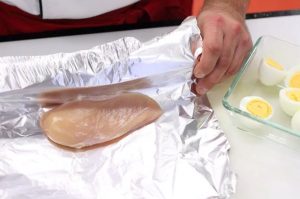 Laviamo il petto di pollo, lo strofiniamo con sale, lo avvolgiamo in un foglio e infornare a 180 ° 15 minuti. Raffreddare e tritare cubi.