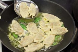 Stendi delicatamente l’impasto e ritaglialo con un bicchiere pezzi rotondi. Metti il ripieno di zucca e modellalo ordinariamente gnocchi. Cuocili in acqua salata.