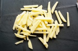 - Anche le patate crude vengono tagliate a strisce e quindi fritte. Dovrebbe essere patatine fritte.