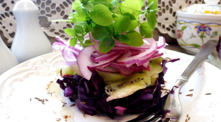 - Metti l’insalata su un piatto con uno scivolo, alternando gli strati. prima metti cavolo, poi kiwi, poi cipolle e pidocchi di legno. versare condimento e cospargere con semi di cumino. Buon appetito!