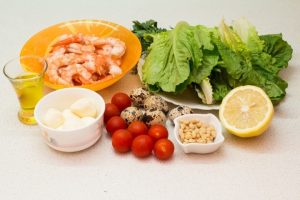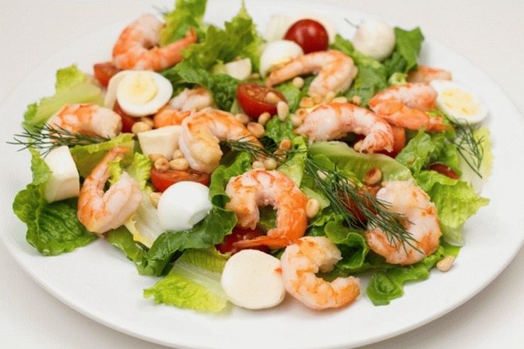 - Distribuire i gamberi sulle foglie di lattuga. Insalata spray succo di limone, sale e pepe qb, deporre le uova in cima, pomodori, formaggio, aggiungere un po ‘di olio d’oliva e cospargere verdure e pinoli.