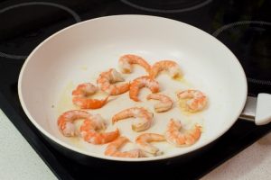 - Friggere i gamberi per 2 minuti su entrambi i lati in una padella con olio d’oliva