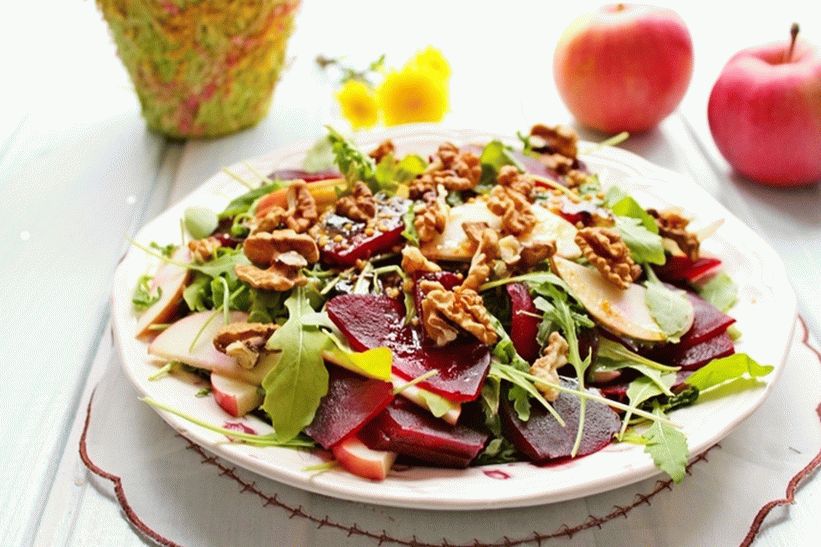 Consiglio di cucinare a casa una deliziosa insalata con mela, barbabietola rossa e noci. Il punto forte dell’insalata è il suo condimento – un incredibile mix dei gusti più vari che è facile da preparare secondo questa ricetta.