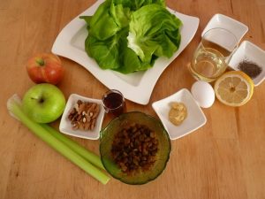 - Aggiungi l’uvetta al sedano e alle mele, mescola e mettere le foglie di lattuga. Innaffia il condimento e decora noci.