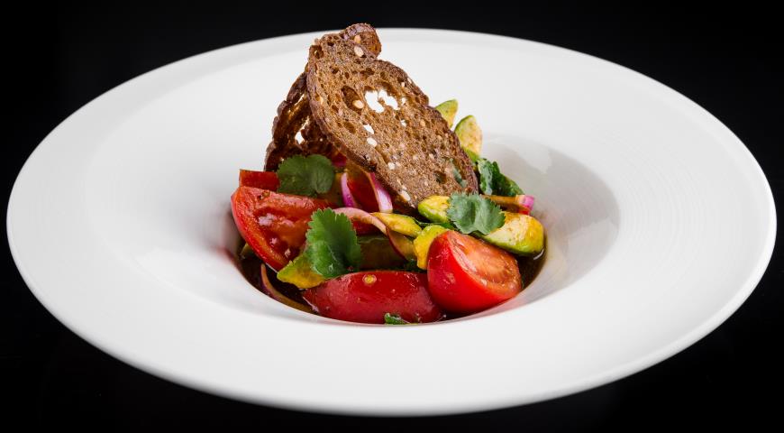Gustosa insalata con pomodori rosa, avocado, cipolla rossa e il coriandolo, che puoi cucinare facilmente a casa, ti consiglio di preparare sia per un pasto normale che per una tavola festiva.