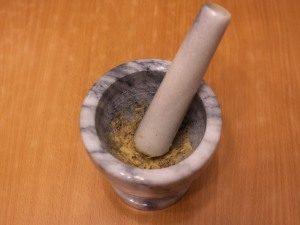 - Schiaccia pepe, sale, aglio in un mortaio. Versare erbe secche versare l’olio d’oliva, mescolare bene.