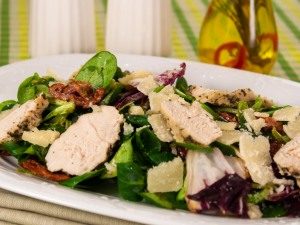 - Raccogliamo la nostra insalata. Metti l’insalata condita sul piatto, su lui fette di pollo al forno e parmigiano a fette sottili.