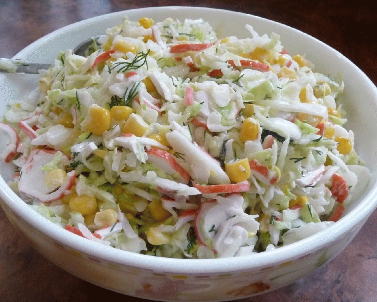 - Mescolare cavolo, uova, mais e bastoncini. Aggiungi maionese e mescola. Fatto! Guarnire con aneto come desiderato. Serviamo