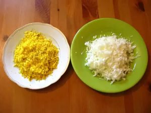 - Su una grattugia fine strofiniamo successivamente una mela, una carota, un formaggio. Dopo aver separato l’albume dal tuorlo, li strofiniamo anche separatamente.