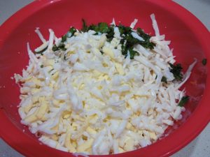 - All’aglio, alle carote e al formaggio aggiungiamo uova e prezzemolo.