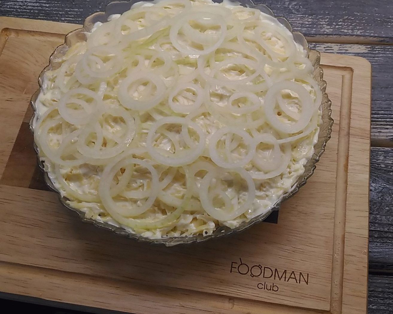- Raccogli la lattuga a strati. Pollo – maionese – uova – maionese – formaggio – maionese – anelli di cipolla. La maionese non è necessaria in cima.