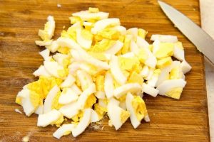 - Uova sode, fresche sotto acqua corrente fredda, tagliare prima a metà e poi a fettine sottili.